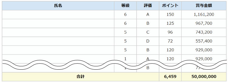 賞与原資を総ポイントで割るとポイント単価を求めることができます。賞与原資が5千万円の場合、6,459ポイントで割るとポイント単価は7,741円となります。