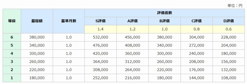 賞与額 = 等級別基礎額 × 基準月数 × 評価係数