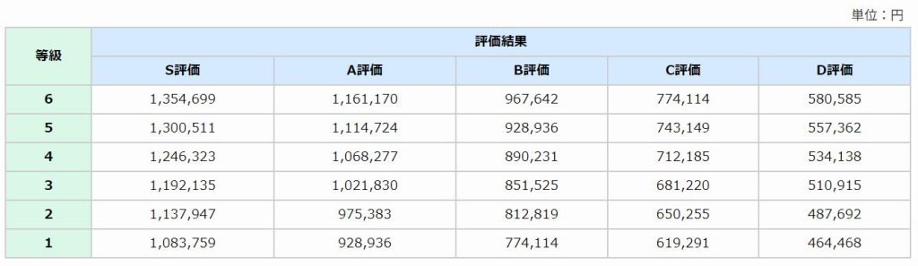 ポイント表で定めたポイント数にポイント単価を掛けると、等級と評価結果に応じた賞与額を算出することができ(下記の賞与額表参照)、個人ごとの賞与額が確定します。