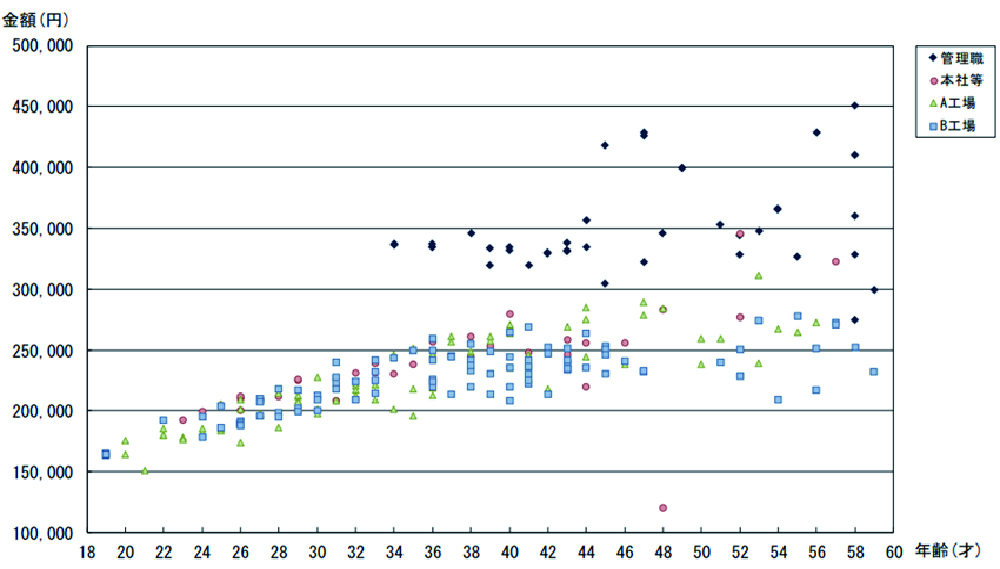 個別賃金を分析することで、制度上の歪な部分を明らかにすることや、不明確な賃金項目、本来処遇対象とすべきだった項目の洗い出しが可能となります。また、賃金分析時には以下のようなプロット図を用いることを推奨します。これは、数字の羅列だけでは認識しづらいエラーを視認することが出来るためです。