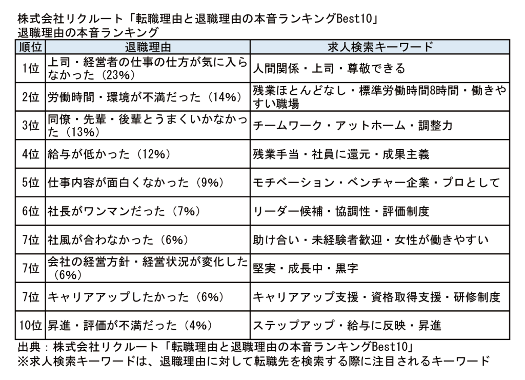 株式会社リクルートが公表している「転職理由と退職理由の本音ランキングBest10」は下記の内容となっています。