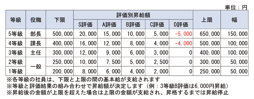 基本給の例としては、等級と評価結果に応じて基本給が支給される範囲職務給の考えに基づいたゾーン型賃金表を導入する企業が増えています。賃金表は世間相場や賃上げなどの外部環境に配慮しながら、等級ごとに求める役割や定義をもとに賃金表を作成します。