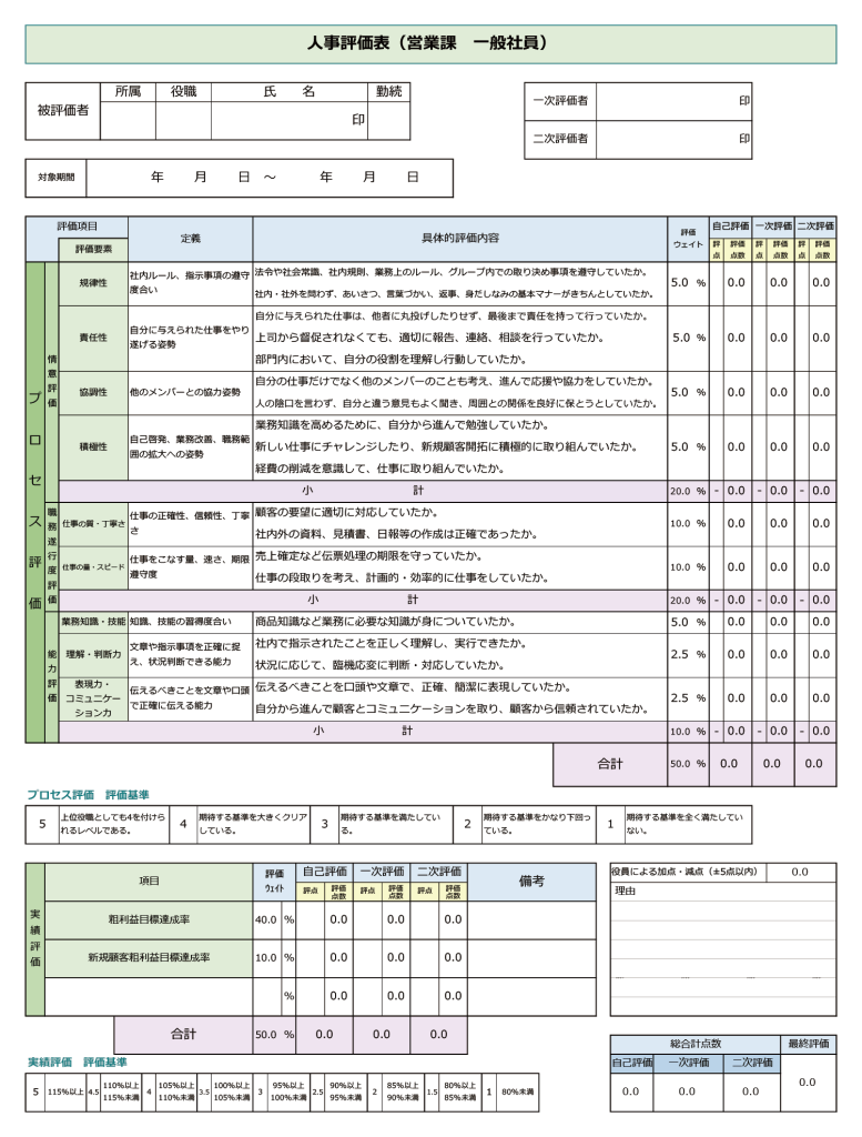 評価制度を適切に運用するためには、等級別や階層別などに会社が求める職務内容やスキルレベルを盛り込んだ自社オリジナルの評価表を作成する必要があります。また、評価表に定めた評価項目に対する評価の基準も明確化することが重要です。以下に評価表の例を掲載します。
